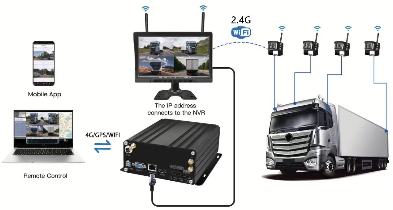 AHD Sürücü Monitorinqi Kabin İçi Görünüş KamerasıCarleader 10.1 Inch 4CH Wireless HDD Mobil NVR Sistemi, donanmanın idarə edilməsi üçün nəzərdə tutulmuş qabaqcıl mobil NVR sistemi. Sistem 2,4 GHz siqnal vasitəsilə 10,1 düymlük simsiz monitor ilə birləşən 4 ədəd simsiz IP kameradan istifadə edir, sonra montior və NVR-ni RJ45 konnektoru ilə birləşdirin. Əlavə məftil probleminə ehtiyac yoxdur, quraşdırma və donanmanın idarə edilməsi üçün daha effektivdir.