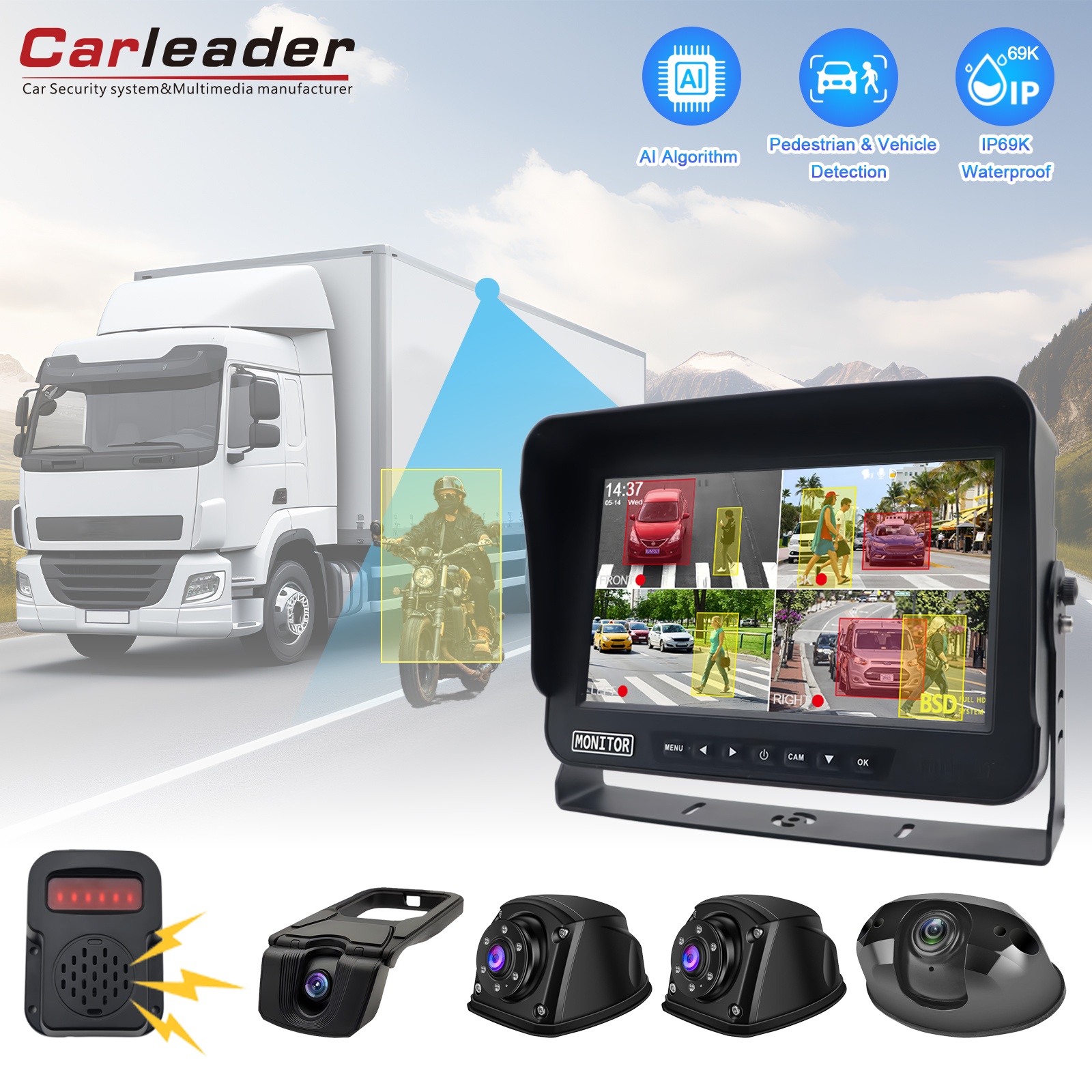 Carleader 10.1 düymlük Vasitə BSD Kor Spot Detection Monitorinq Sistemi, yük maşınları, avtobuslar, təcili avtomobillər və xüsusi nəqliyyat vasitələri üçün hazırlanmışdır. Advanced AI görüntü alqoritmləri və yüksək performanslı bir çip ilə təchiz olunmuş, bu sistem, toqquşmaların qarşısını almaq üçün vaxtında piyadalar, velosipedçilər, motosikllər, mikroavtobuslarda və heyvanları ağıllı şəkildə aşkar edir.