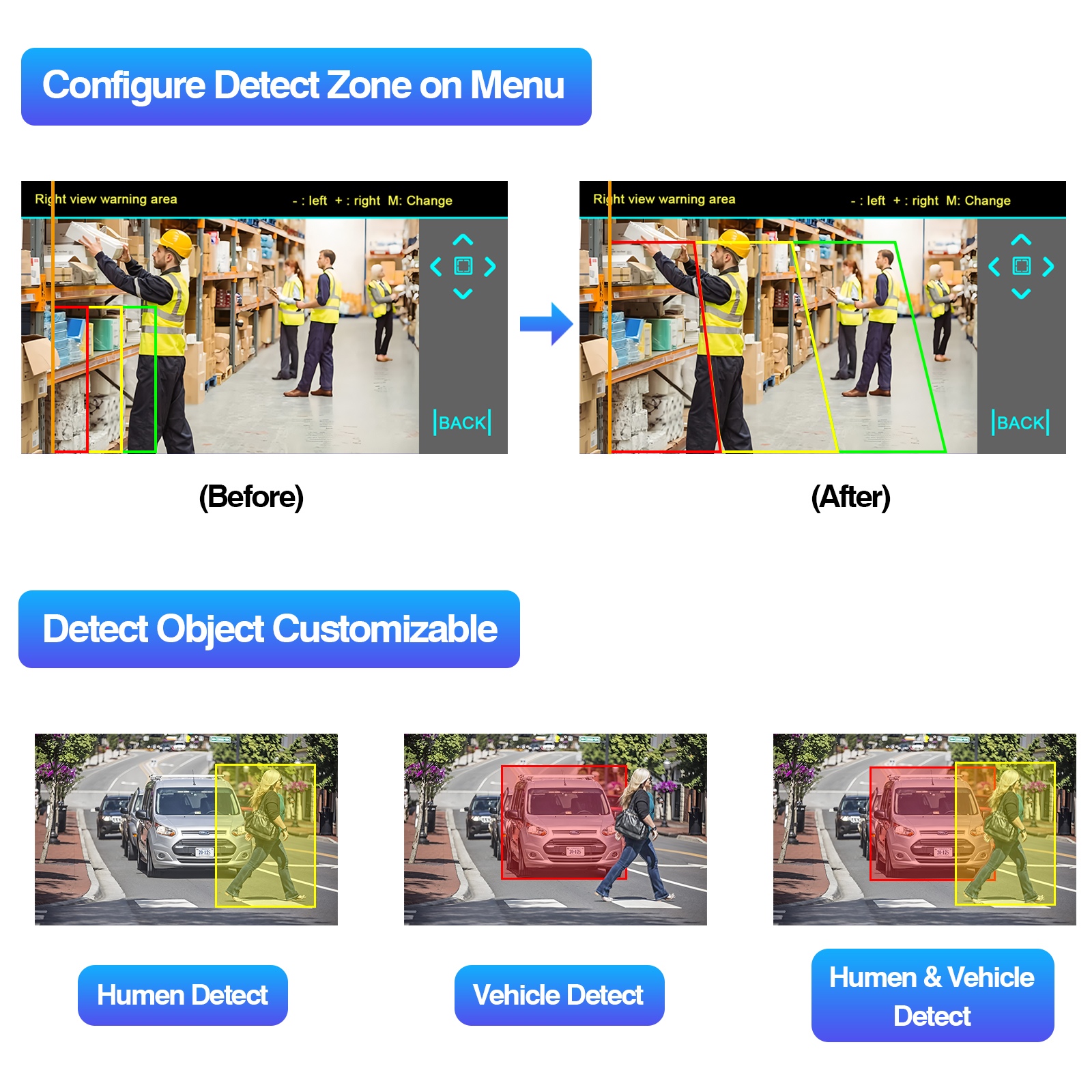 Ağıllı aşkarlama: Kor zonalara girən obyektlər üçün real vaxt xəbərdarlıqları, AI funksiyasının kalibrini dəstəkləyin, trapezoidal kalibrləmə xətləri ilə tənzimlənən (xəbərdarlıq sahələri üçün yaşıl, nəqliyyat vasitəsi yerləri üçün mavi).