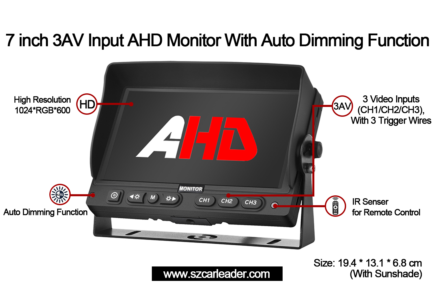 Donanmanın idarə edilməsi, təhlükəsizlik monitorinqi və ya sənaye istifadəsi üçün mükəmməldir, Carleader7 düymlük 3 kanal AHD girişləri avtomobil ehtiyat monitoruetibarlılıq, çox yönlülük və istifadəçi mərkəzli innovasiyaları kompakt formada birləşdirir.