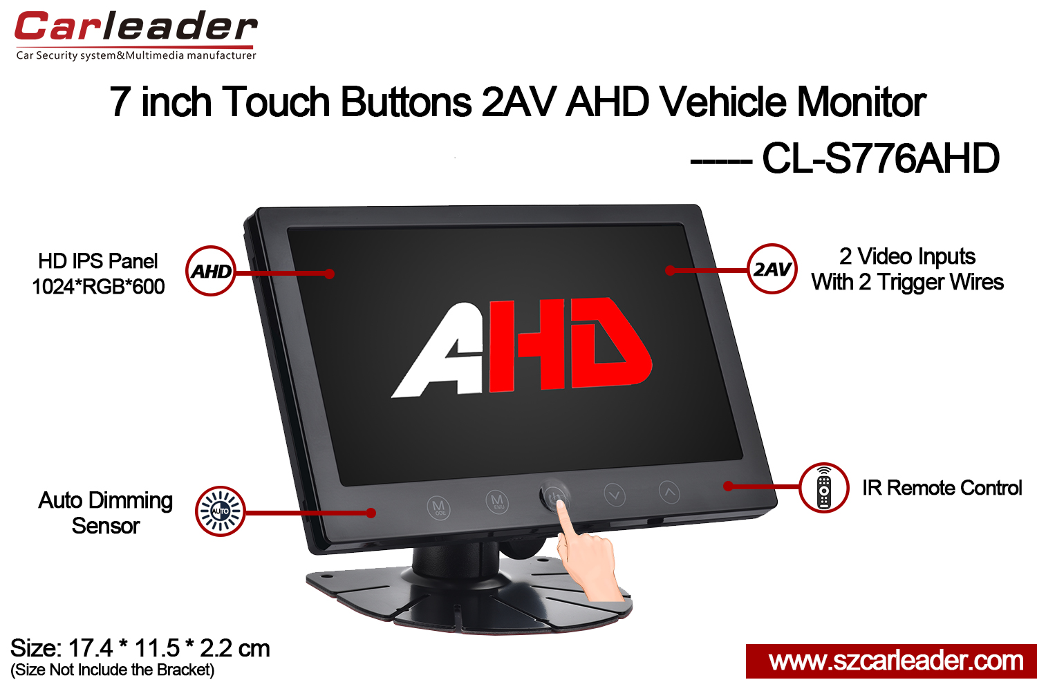 Carlider7 düymlük IPS Ekran 2CH AHD Giriş Toxunma Düymələri Ağır Avtomobil Monitoruavtomobil, təhlükəsizlik, dəniz və sənaye istifadəsi üçün idealdırdavamlılığı, çevikliyi və yüksək keyfiyyətli ekran performansını bir etibarlı paketdə birləşdirir.