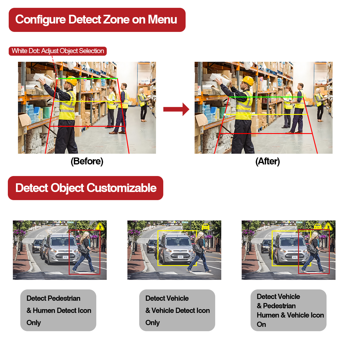 Daxili xəbərdarlıq işığı funksiyası olan bu süni intellekt kamerası aşkarlama obyekti müxtəlif aşkarlama sahəsinə (Qırmızı, Sarı, Yaşıl) daxil olduqda açıq rəng uyğun rəngə dəyişəcək. Həm də avtomobilinizə yaxınlaşan piyada və avtomobili əhatə edən həyəcan siqnalı ilə inteqrasiya edin.