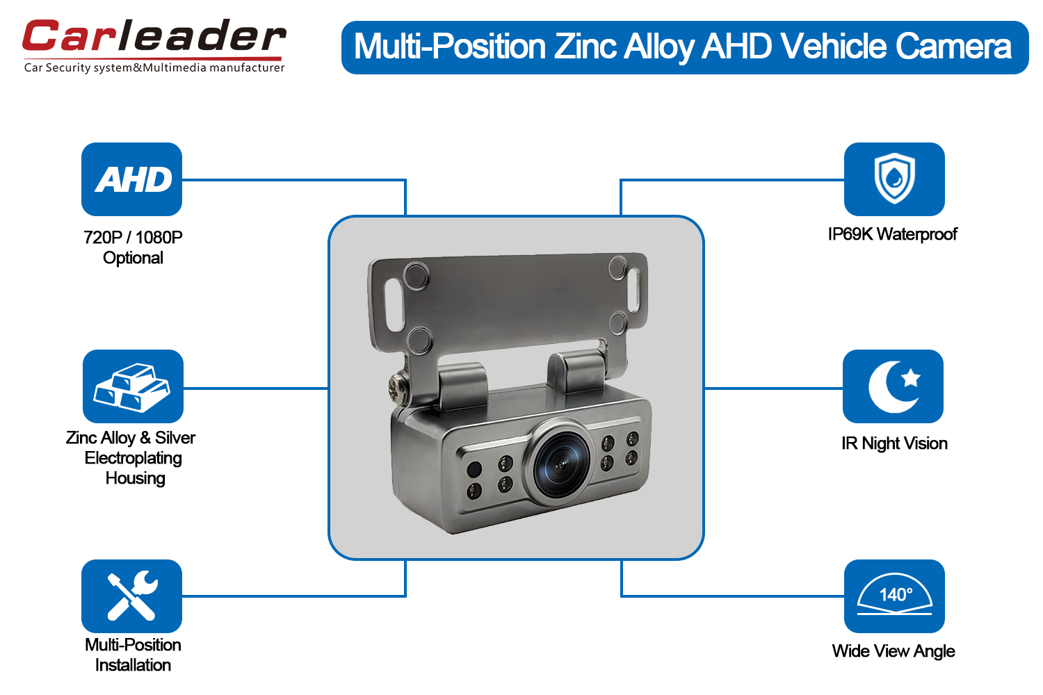CarliderAHD Gümüş Elektrokaplama Avtomobilin Geriyə Baxma Kamerası, sink ərintisi korpusu və gümüş elektrokaplama ilə, 140 dərəcə geniş baxış bucağı və IP69K suya və toz keçirməz. Quraşdırma bucağı və mövqeyi də vintlər ilə sabitlənə bilər.