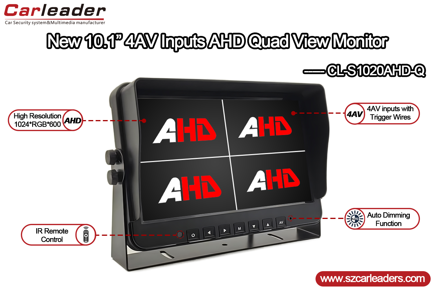 Avtomobil, təhlükəsizlik və sənaye monitorinqi tətbiqləri üçün idealdır,Carlider10,1 düym 4 kanallı dördlü displey Ağır Yük Avtomobili AHD Monitorukompakt və davamlı paketdə möhkəm funksionallığı, aydın ekran keyfiyyətini və istifadəçi tərəfindən konfiqurasiya edilə bilən variantları birləşdirir.
